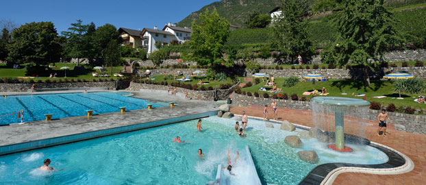Eine Besonderheit ist das terrassenförmig angelegte Freibad mit der 75 Meter langen Rutsche, Kleinkinderbecken und Spielplatz. Zahlreiche Attraktionen im Innenbereich wie Sprudel- und Massageliegen, Strömungskanal, Whirl- und Solepool oder eine italienische Pizza garantieren auch bei schlechtem Wetter ein lachendes südtiroler Herz.